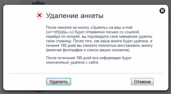 - После этого всплывает информация об отправлении письма со ссылкой на e-mail. Также сообщение рассказывает о возможности вернуть свою страницу в течение 180 дней. Полгода – большой срок, в личной жизни может что-то измениться и анкета с фотографиями и контактами станет вновь актуальной. Чтобы продолжить стирание сведений, необходимо нажать «Удалить».