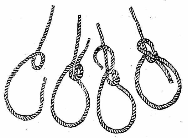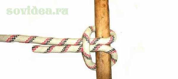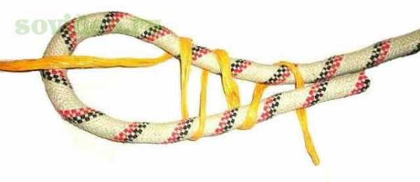 Удавка на опоре вяжется следующим образом: канат охватывает опору, входит в петлю и оборачивается вокруг нее 3 раза, затем проходит в малую петлю. Даже если веревка мокрая, образуется устойчивое соединение, которое можно использовать и без опоры.