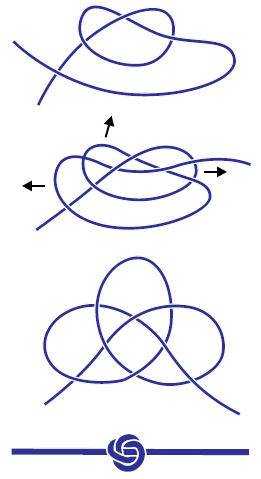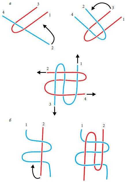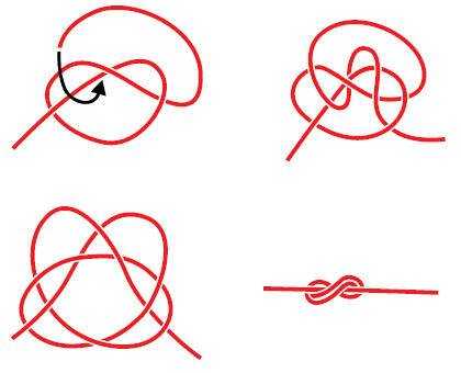 3. Протянуть пересекающиеся стороны больших петель простых узлов в противоположных направлениях и провести их через полуузлы.