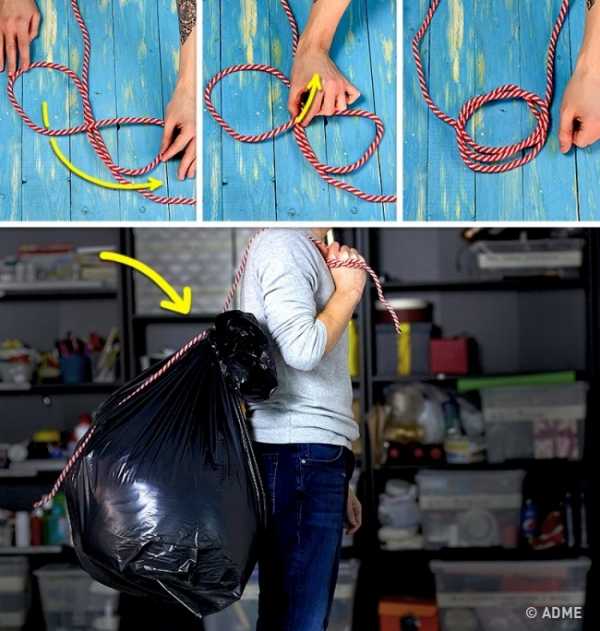 Как делать. Кладем предмет на веревку и обвязываем его самым обычным узлом, которым завязываем шнурки. Затем петлю узла растягиваем на стенки предмета и затягиваем.