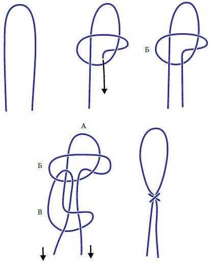 4. Развернуть конец шнура в противоположном направлении и, сложив петлей В, завести сверху вниз в петлю Б. Обвести снизу вторую сторону петли В и провести сверху вниз, в пересечение петель Б и А.