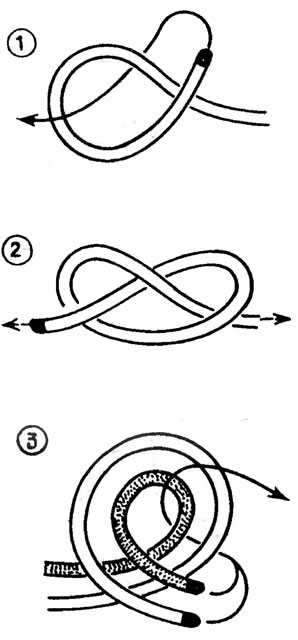 3. Коренной конец шнура провести сверху вниз через петлю 3, а ходовой конец шнура через тыльную сторону петли 1.
