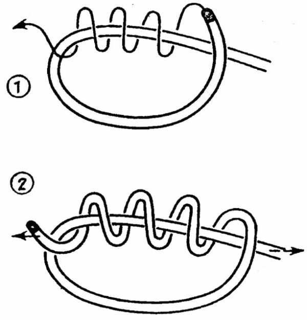 2. Ходовой конец шнура 2 продеть в петлю шнура 1 и провести над закрытой петлей шнура 1.