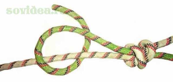 Как делать. Берем край петли из тонкой веревки и делаем 3–4 витка вокруг основной веревки, при этом пропуская конец через петлю. Без нагрузки этот узел отлично скользит по веревке и его можно легко передвигать рукой. Но если на узел подается нагрузка, то он затягивается намертво и не сдвинется с места.