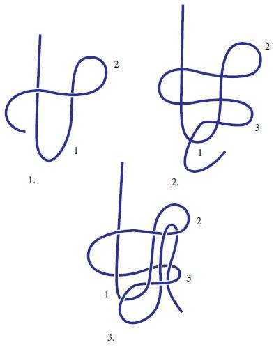 3. Последовательно провести шнур через петли 2 и 3 и, развернув ходовой конец на 180°, вновь провести через петлю 3.