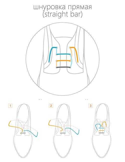 Прямая шнуровка дает возможность сделать на обуви горизонтальные линии, которые особенно эффектно сочетается с классическими видами обуви. Такой вариант смотрится одновременно легко и элегантно. Прямая шнуровка особенно хорошо подходит ботинкам с множеством отверстий по каждой стороне. Единственный минус такого способа в том, что затягиваются завязки довольно проблематично, в особенности если обувь плотно сидит на ноге.