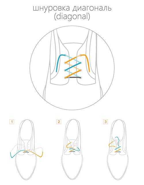 Красиво завязать шнурки на женских ботинках поможет диагональный способ шнуровки. Он немного похож на традиционный, но в отличие от него этот метод состоит из той же фигуры, в которой одна часть идет по внутренней, а другая — по внешней стороне. Такой способ одновременно свеж и универсален. Диагональная шнуровка может быть схожей на обоих ботинках или зеркальным отражением друг друга.