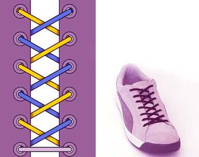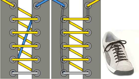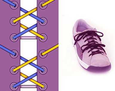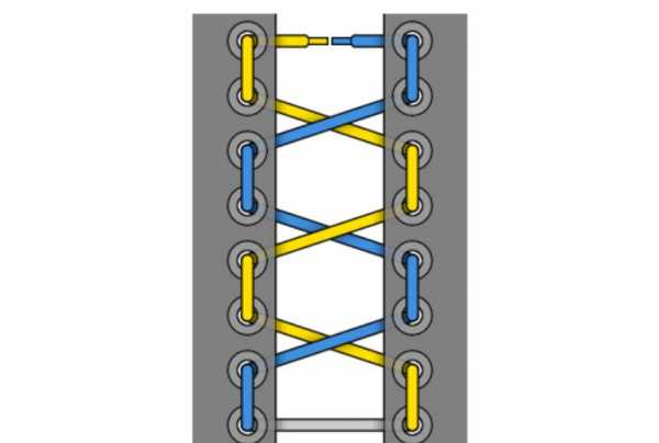 — один шнурок (желтого цвета) проходит справа снизу наверх, после этого заходит в левое отверстие сверху вниз и протягивается под низом через одно отверстие, после чего выходит наверх.