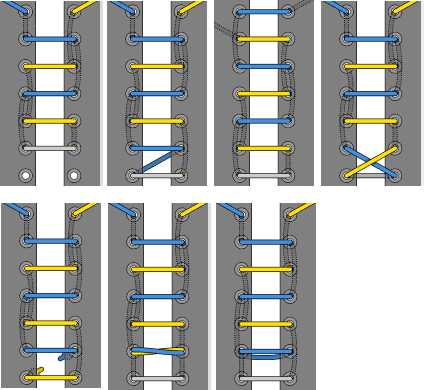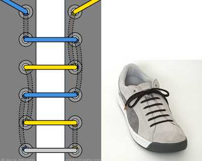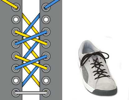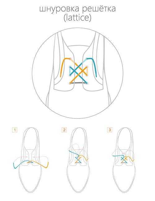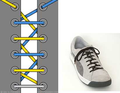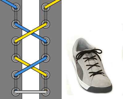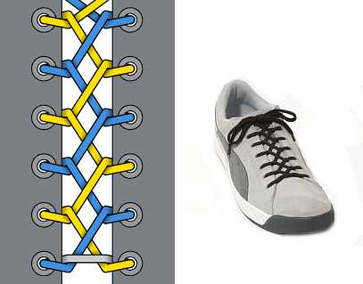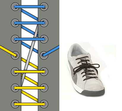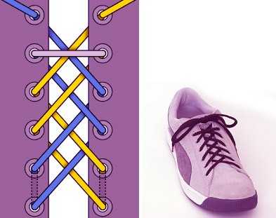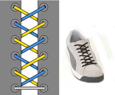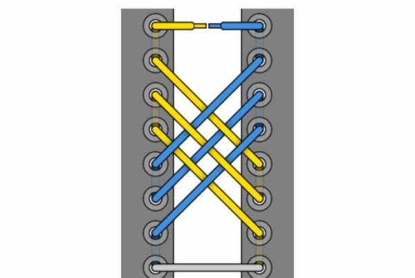 Очень декоративная шнуровка, особенно для высоких ботинок или сапог с использованием шнурков контрастного цвета. Внимательно следуйте схеме, чтобы не запутаться (начинаете с серого отрезка-середины шнурка, затем один конец показан голубым, другой — жёлтым).