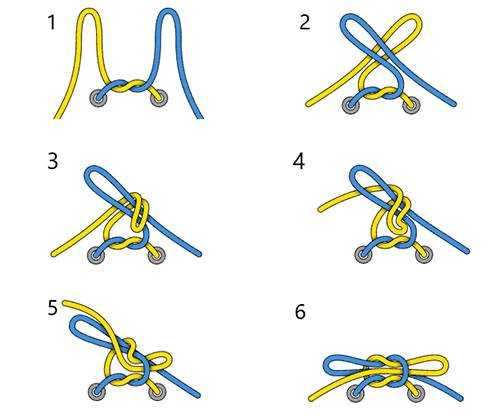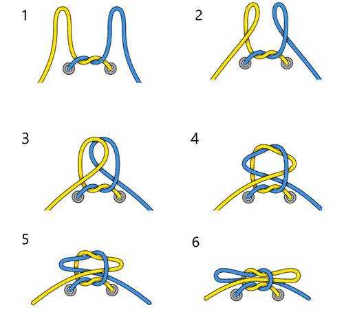 Добавочный узел на каждом шаге шнуровки увеличивает её прочность и улучшает внешний вид. Способ идеален для шнуровки лыжных ботинок, роликов и т.д. Ослабить шнуровку очень проблематично.