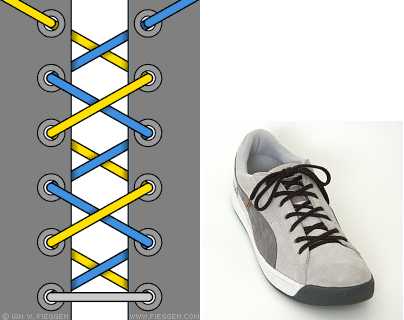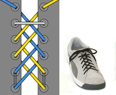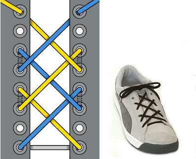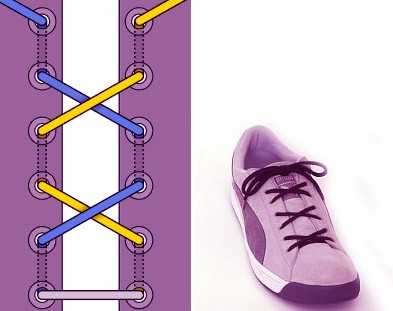 Шнурок пропускается через нижние дырки и выводится наружу с обоих концов. Концы пересекаются, а затем пропускаются изнутри наружу через отверстия. Доходите до верхних дырочек и завязываете шнурки. Этот метод лёгок и удобен; сминает ботинок, а не ногу.