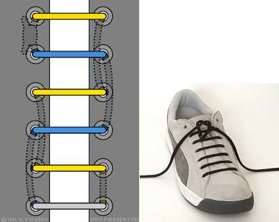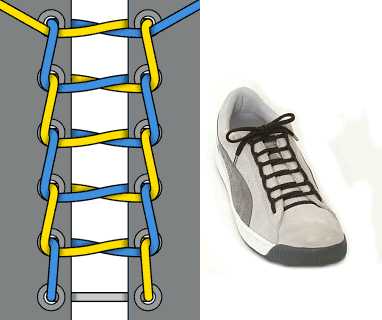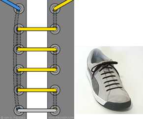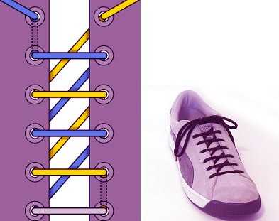 Очень похож на предыдущий метод, только на изнанке шнурки идут не по диагонали, а прямо. Этот способ шнуровки подходит только для тонких или плоских шнурков, потому что шнурки проходят через дырочки дважды. Именно поэтому шнуровка очень прочная, однако её сложно затянуть.
