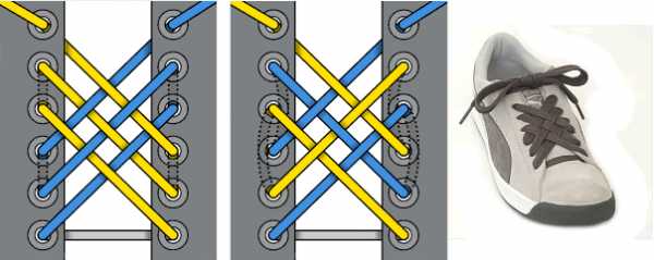 — шнурки проходят через нижние отверстия вверх с каждой стороны.