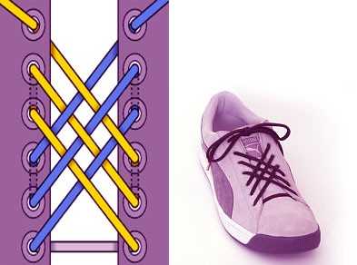 19. Шнуровка паутинкой. Хорошо подходит для ботинок с широким языком, формируя плотную паутину в середине.