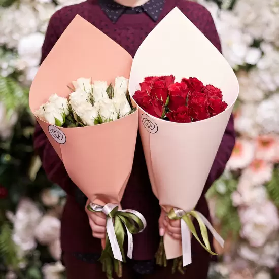 - Закажите букет с оригинальным сочетанием оттенков роз, например, бело-красным, красно-оранжевым, малиново-белым или сине-черным