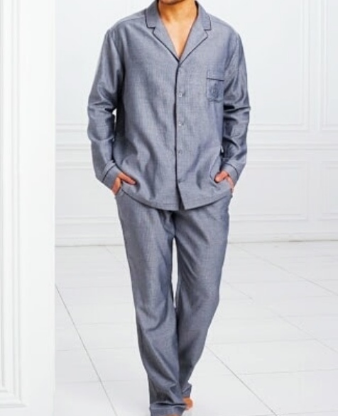 - Классическая мужская пижама это комплект из брюк прямого покроя и такой же рубашки, имеющей длинные рукава до запястья. Изготавливается из атласа, шелка, хлопка. Цветовая гамма обычно спокойных сдержанных тонов. Например, коричневая, серая, синяя, белая, черная.