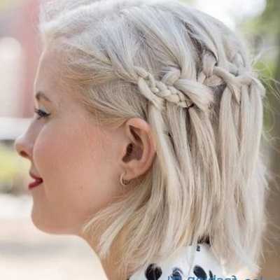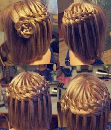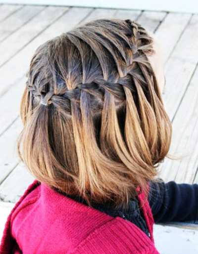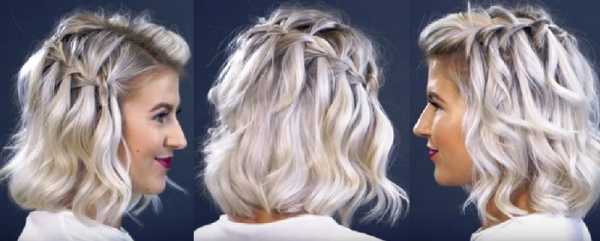 Французский водопад отлично будет смотреться на коротких волнистых волосах. С этой причёской всегда можно экспериментировать. Например, заплести косу не прямо, а с небольшим наклоном.