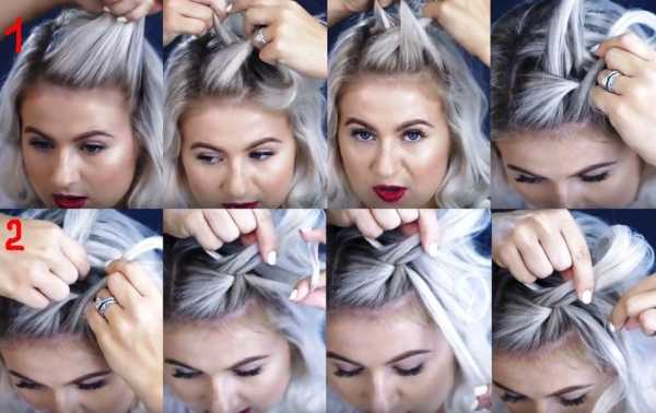 - Отделить прядь у лба, разделить пополам и скрестить половинки между собой.
