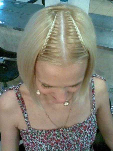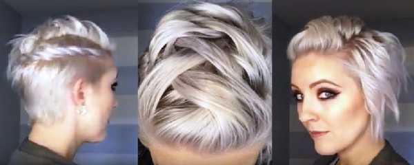 И на очень коротких волосах можно сотворить необычную и очень симпатичную причёску с использованием двух разных вариантов плетения косы.