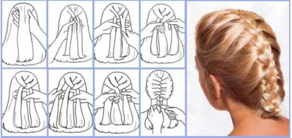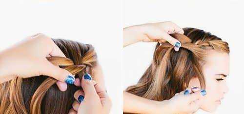 - Начать нужно с ближайшей к пробору пряди и перекинуть сверху на центральную.