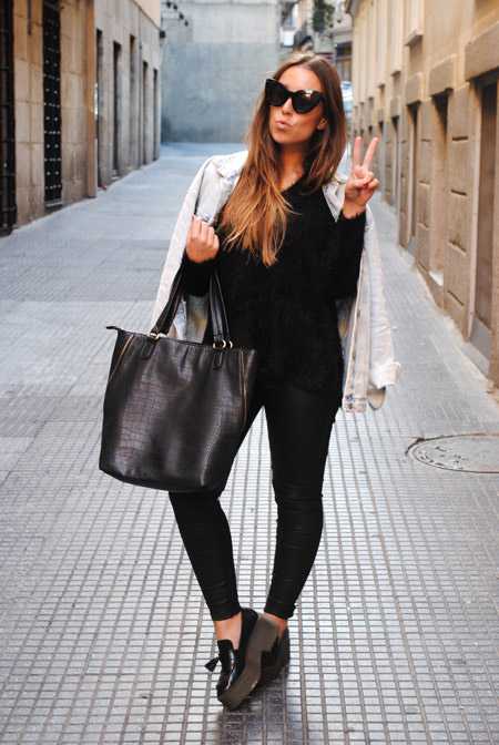 Продолжая укороченную тему, отметим, что черным лоферам по духу близки винтажные голубые джинсы и свободные черные блузки. А также коротковатые скинни (в том числе актуальные черные с прорезями на коленях) и всевозможные приталенные джемперы и водолазки. Плюс подвернутые бойфренды, кардиганы оверсайз и объемные шарфы.