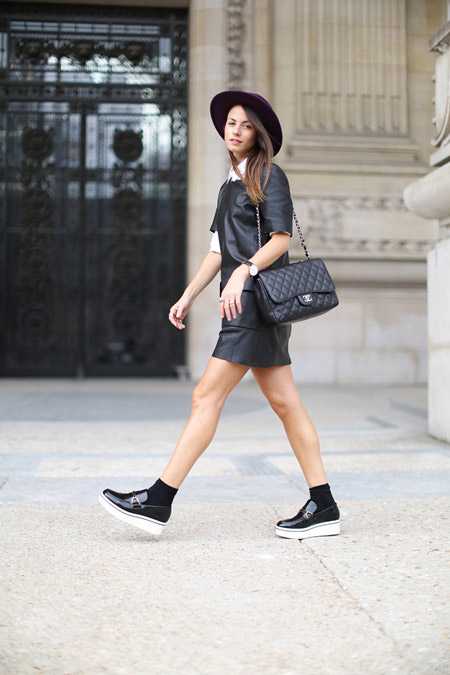 Ни с чем другим так не смотрится прямое платье из кожи, как с черными лакированными лоферами на платформе. И есть еще несколько удачных решений. Попробуйте соединить в единый лук приталенное короткое серое платье, черную косуху и такого же цвета лоферы на платформе. Либо свободное платье рубашку и те же лоферы. Надеемся, что вам понравится, ведь мы просто без ума от таких образов.
