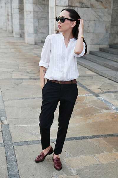 Очаровательно смотрится комплект из белых шорт и такой же майки, дополненный коричневыми лоферами и ремнем в тон обуви. Узкие джинсы, брюки скинни, бананы, чиносы смело надевайте с лоферами и джемпером или пуловером, также подойдет свитшот или водолазка.