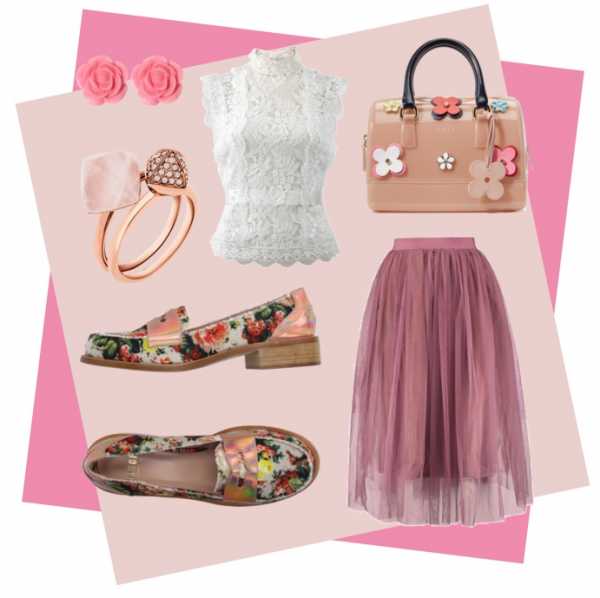 - Отправляясь на свидание в расклешенной юбке длины миди, вы вполне можете надеть лоферы на венском каблучке. Можно стилизовать наряд под кантри, выбрав нежный цветочный принт, вышивку на блузе или выбитый узор.