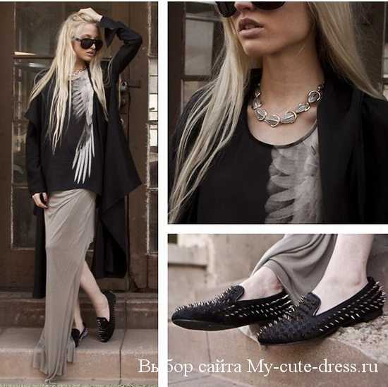 - Шифоновая юбка в пол тоже может гармонировать с лоферами, но модель обуви должна быть максимально изящной и обязательно на тонком каблуке.