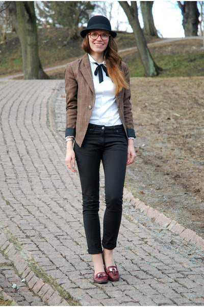 Чтобы все окончательно сбалансировать, накиньте черный длинный кардиган и шляпку. Этот образ идеален для романтических свиданий, но с теми же брюками можно соорудить и офисный лук. Для этого понадобится обычный однотонный топ и жакет в мелкую клетку (если клетка будет черно-белой, то с ней отлично по контрастируют бордовые лоферы), либо однотонный серый.