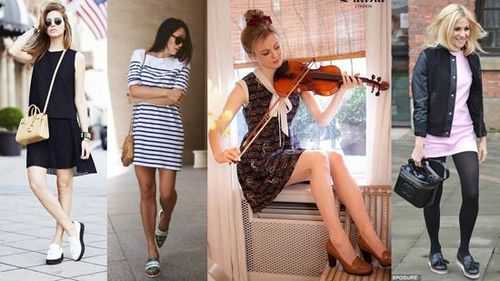 С лоферами носят различные платья – платье-рубашка, приталенное платье с расклешенной юбкой, платье-футляр, платье-баллон, платье-туника, ажурное платье в винтажном стиле.
