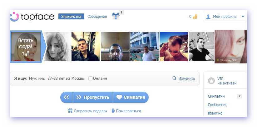 В любом случае Топфейс поможет вам найти подходящего человека. Знакомства по всей России, это превосходный виртуальный чат, где можно все.