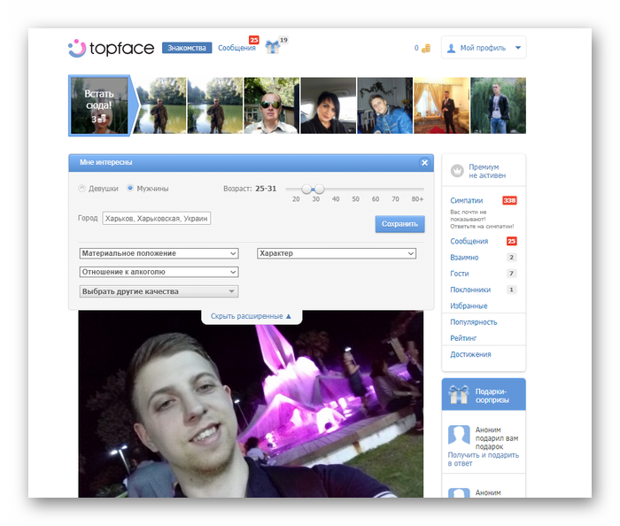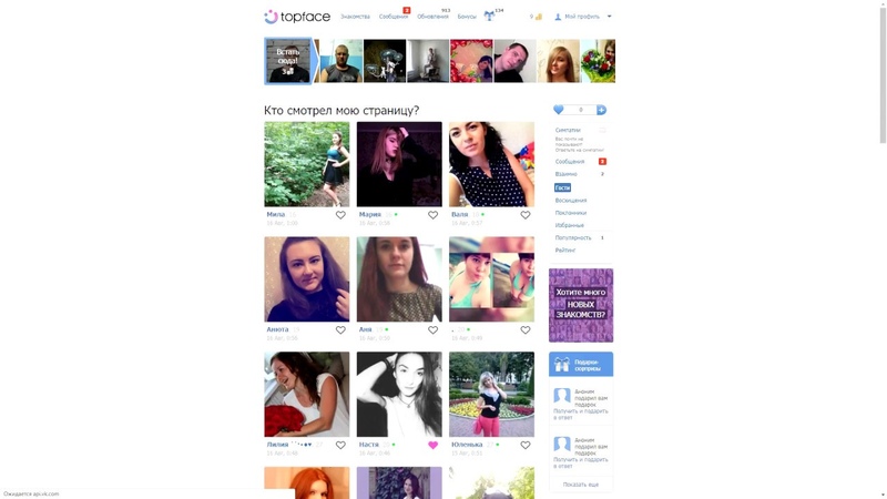 Знакомства и общение Топфейс объединяет и знакомит людей, приложение активно использует более 100 млн. Топфейс поможет найти того, кого вы действительно ищите. Зарегистрироваться можно за пару минут или войдите черз соцсеть: Вконтакте, Facebook, Одноклассники. После того как вы войдете на сайт знакомств, заполните свой профиль и начнете поиск собеседника или своей любви.