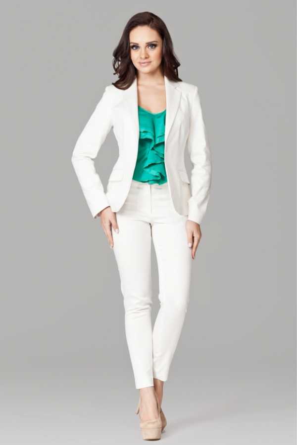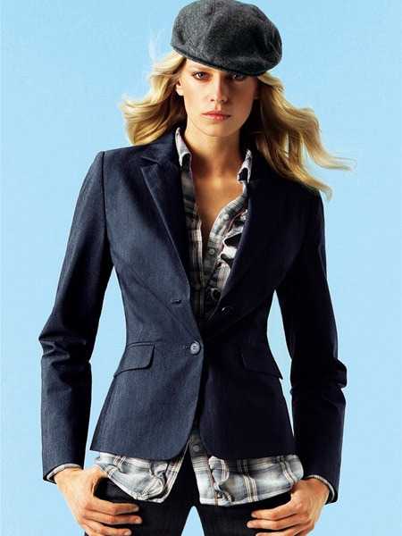 При наличии высокой застежки пиджак может носиться без блузки, но это скорее исключение из принятых правил стиля. Лучше всего подобрать подходящую блузу, которая должна контрастировать по цвету с пиджаком и иметь отложной воротник, который дополнит образ и создаст натуральный классический облик. Современная мода, идущая на упрощение, позволяет надевать под пиджак футболку или майку с небольшим вырезом горловины, обязательно отличающуюся по цвету от пиджака.