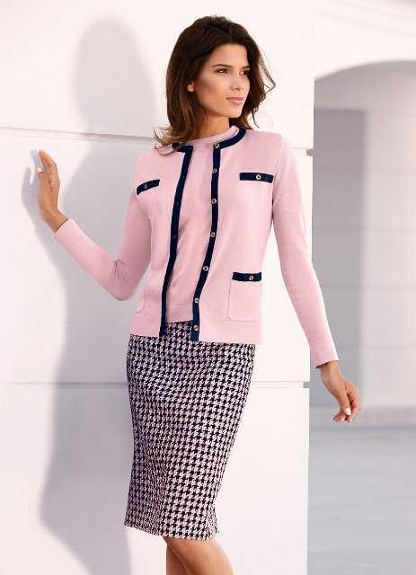 Кроме того, недлинный приталенный кардиган, чуть доходящий до бедер, хорошо сочетается с платьями и зауженными юбками до колен.