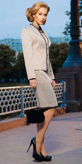- сдержанный декор исключает в оформлении костюма применение таких деталей как воланы, рюши, оборки, банты;
