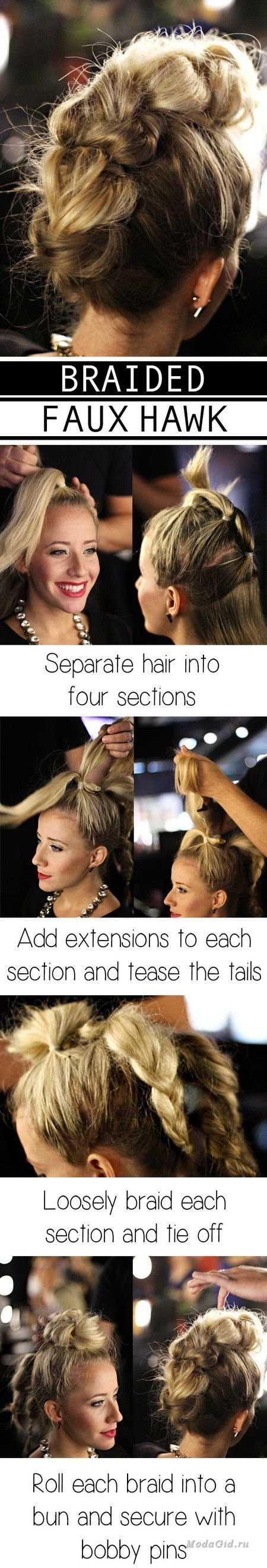 3. В данном варианте фальшивого ирокеза волосы делятся на 4 части. Каждая часть собирается в хвост и слегка начёсывается. Затем следует из каждой части волос заплести косы и обвернуть их вокруг основания, закрепив шпильками.
