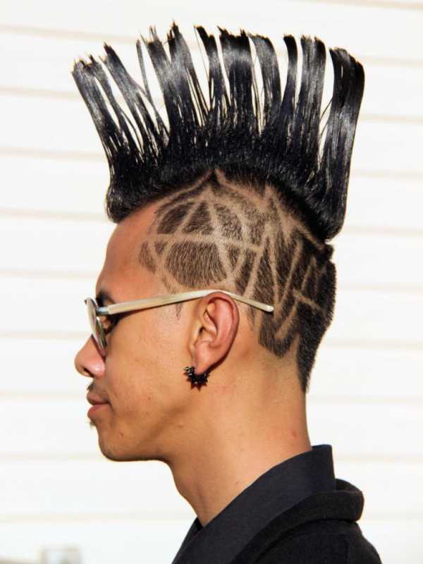 Такие узоры будут красиво и по-особенному смотреться с классическим ирокезом или прической «Широкий ирокез». Парикмахер с помощью специальной машинки выбривает схемы на висках по заранее подготовленному эскизу. Они могут размещаться как на одной стороне, так и полностью расположиться по всей поверхности головы.