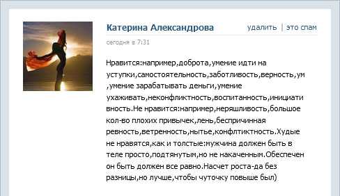 Первое место, по мнению Екатерины, ведь встречают по одежке. «Во внешности аккуратность, одет современно и опрятно» – рассказала она. Человек, который не умеет хорошо одеваться, находится в полном неведении того, как плохо он выглядит в глазах людей, кто умеет одеваться и следит за собой. А большинство женщин как раз такие. Это, к сожалению, для мужчин, кто не любит ходить по магазинам и покупать себе вещи, показатель очень маленькой социальной ценности. И одежда – это не только показатель твоего социального успеха, но и просто подчеркивание твоих физических параметров.