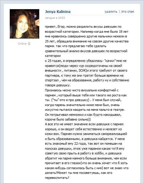 Чтобы наглядно ответить на вопрос, что нравится девушкам в парнях, я обратился напрямую к привлекательным девушкам, состоящих у меня в друзьях. За основу вопроса я взял широко распространенные стереотипы о том, какие парни нравятся девушкам, например такие убеждения как, то, что девушкам нравятся накаченные, худые, высокие, богатые, «плохие», умеющие задавать вопросы при первой встрече и другие. Как я убедился – часть из этого правда, часть – просто мифы.