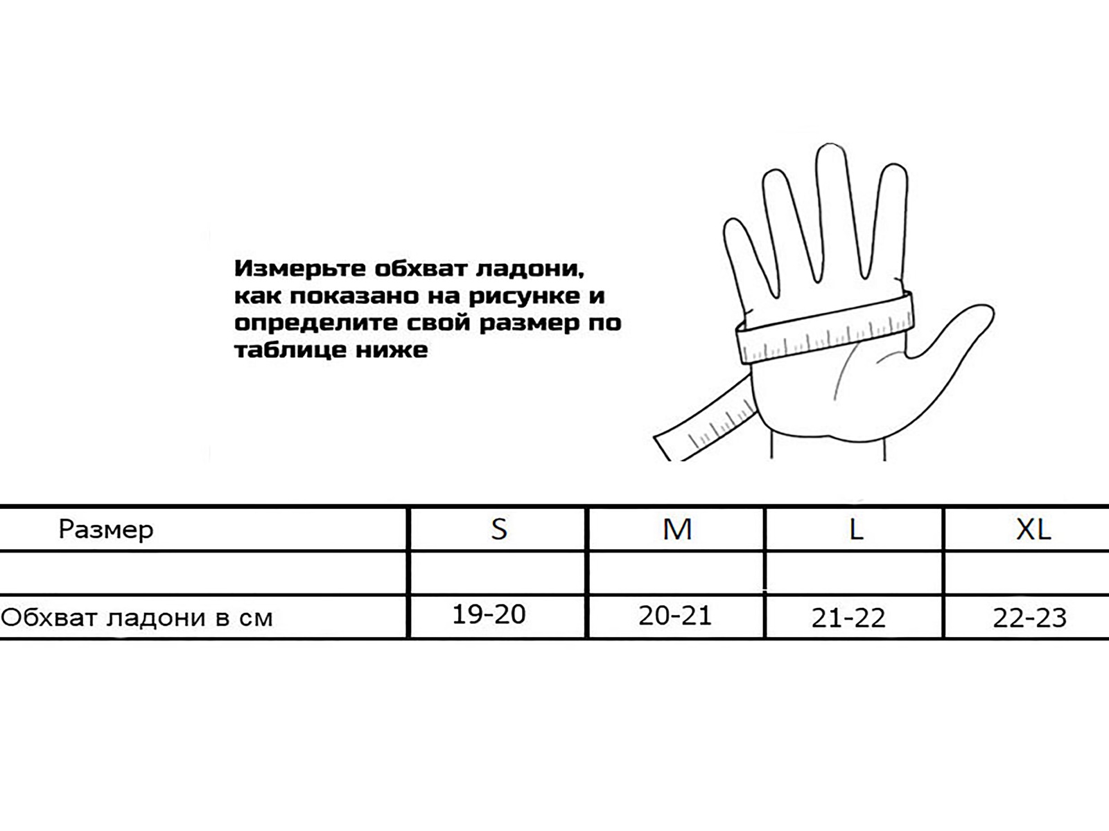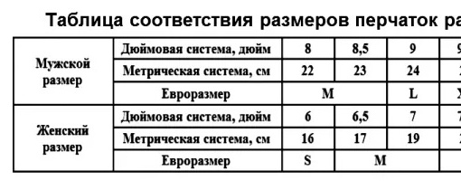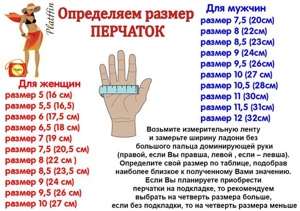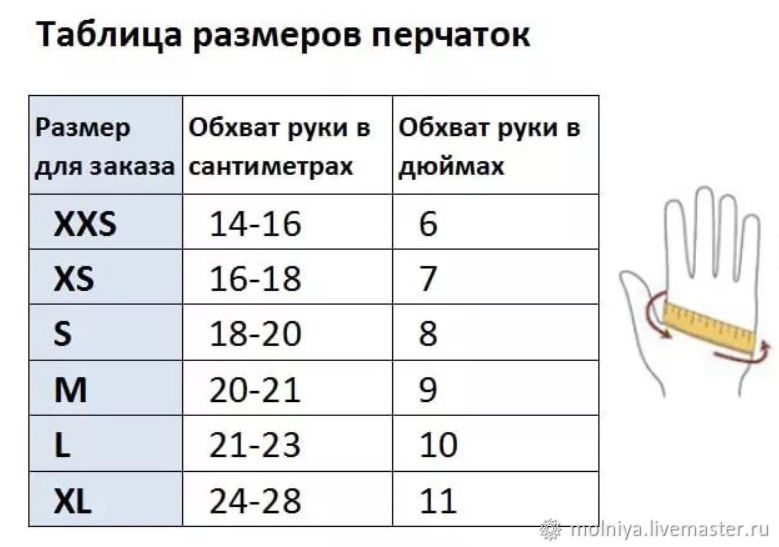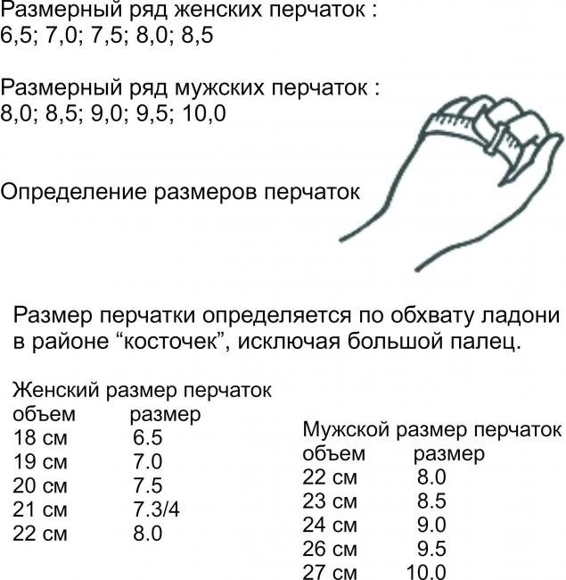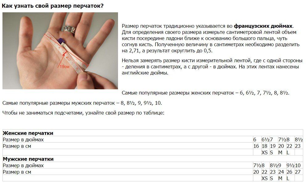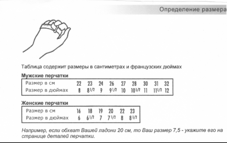 Размер перчаток легко и удобно определяется как с помощью европейской маркировки по французским дюймам, так и благодаря американской маркировке по первым согласным буквам английских слов. Таблица для определения размеров перчаток Общая таблица размеров перчаток как мужских, так и женских, с учетом обхвата киски руки: Обхват ладони (см) Европейский размер (французские дюймы) Американский буквенный размер (для женщин) Американский буквенный размер (для мужчин) 16 5 XS 16,5 5,5 S XXS 17,5 6 S XXS 18 6,5 M XS 19 7 M S 20,5 7,5 L S 22 8 L M 23,5 8,5 XL M 24 9 XL L 26 9,5 XXL L 27 10 XXL XL Важно знать, как подобрать размер перчаток правильно. Перчатки для мужчин и женщин не должны сдавливать руку, препятствуя нормальному кровообращению, широкие перчатки же будут спадывать.
