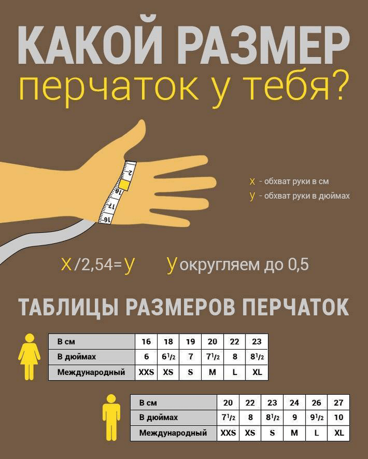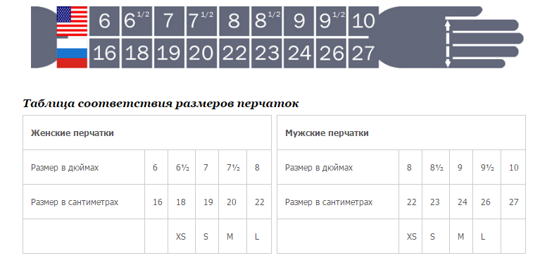 Правда, если вы приобретаете американские перчатки и пользуетесь таблицами определения размеров, которые нередко есть на сайтах производителей, то стоит учитывать, что обхват ладони в них обычно указывается в дюймах. Для того, чтобы правильно выполнить расчеты, их нужно перевести в сантиметры.
