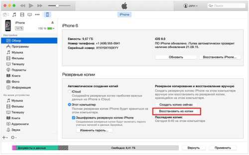 -При восстановлении через iTunes- нажмите в окошке обзора предложение «Восстановить из копии». Выберите из списка самую свежую, полную версию, и запустите процесс. Как правило «компьютерные» копии самые полные – в них содержится и музыка, и фильмы, контакты и фото, переписка, документы и т.п. Правда и грузятся такие «бэкапы» очень долго.