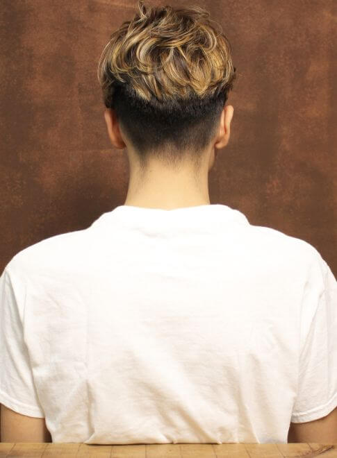 - Снимается длина. До линии, отмеченной резинкой, волосы укорачиваются до выбранной длины или полностью сбриваются. Все зависит от того, будет создан классический образ или авангардный. Все работы выполняются машинкой.