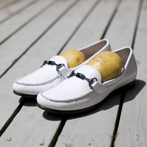 - Если вы боитесь мочить обувь, проделайте то же самое, предварительно положив внутрь каждой туфли по пакету, чтобы кипяток и подкладка не соприкасались.