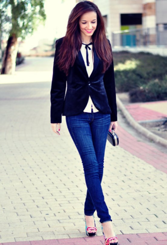 В таком образе смело отправляйтесь в кафе, на прогулку, отличное настроение вам обеспечено. Джинсы очень любят рубашки, поэтому их тоже пускаем в дело. Получается милый и лаконичный образ, который обрамляет синий пиджак.