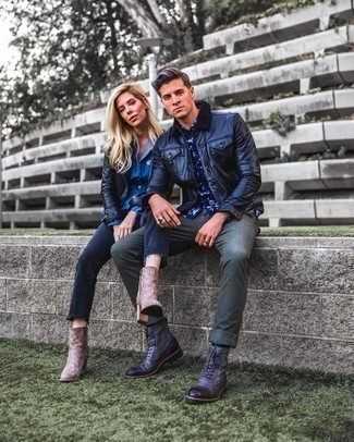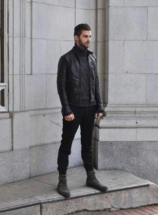 Темно-серые кожаные повседневные ботинки СохранитьУдалитьКомбо из черного кожаного бомбера и оливковых джинсов однозначно будет привлекать внимание прекрасных женщин. Любители необычных луков могут завершить ансамбль темно-серыми кожаными ботинками, тем самым добавив в него немного классики.