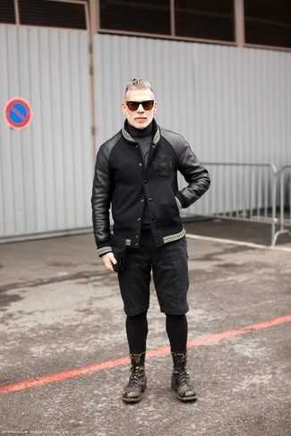 Темно-серые кожаные повседневные ботинки СохранитьУдалитьВыбирая ансамбль для вечера в кино или кафе с подругой, обрати внимание на тандем черного кожаного бомбера и темно-серых шорт. Темно-серые кожаные ботинки добавят чуточку классики в твой ансамбль.
