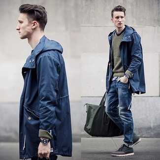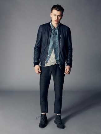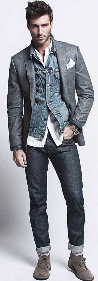 Темно-серые кожаные ботинки дезерты Если ты любишь одеваться по моде, и при этом чувствовать себя комфортно и уверенно, тебе стоит попробовать это сочетание темно-синей ветровки и синих джинсов. Закончив лук темно-серыми кожаными ботинками, можно получить приятный результат.