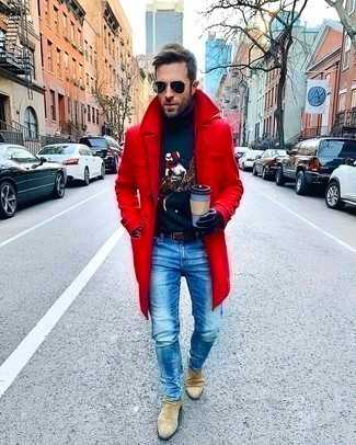 Бежевые замшевые ботинки челси СохранитьУдалитьКрасное длинное пальто и синие джинсы отлично впишутся в любой мужской образ — лёгкий будничный образ или же утонченный вечерний. Вкупе с этим образом органично будут смотреться бежевые замшевые ботинки.